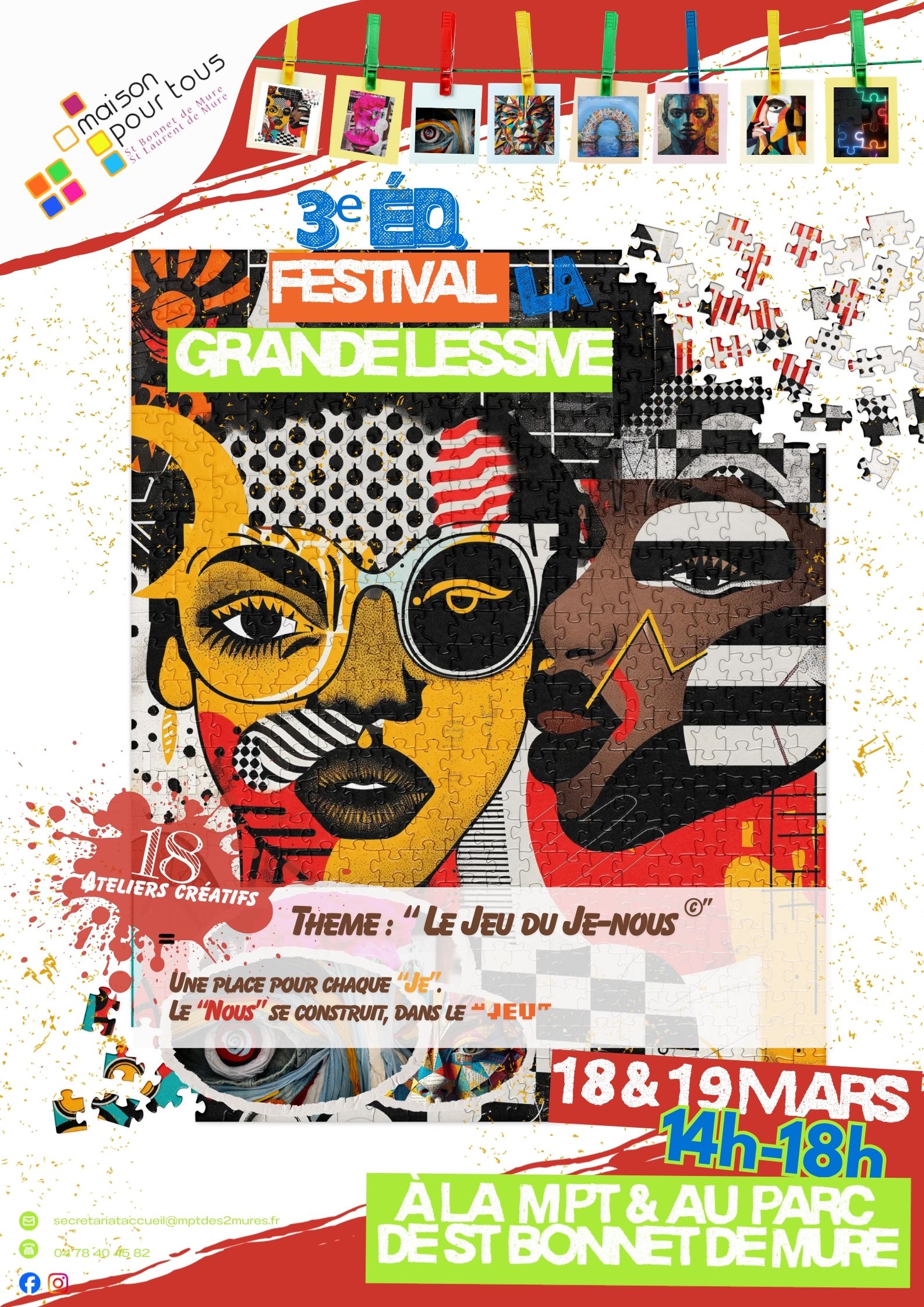Mercredi 18 et jeudi 19 mars, participez à La Grande Lessive autour du thème « Le Jeu du Je-nous © ». Pour l’occasion, la MPT vous propose 18 ateliers créatifs, ludiques et participatifs, ouverts à toutes et tous, autour d’une installation artistique éphémère en plein air : vos œuvres seront suspendues à un fil pour une exposition unique. Une place pour chaque « je », et le « nous » se construit dans le jeu. Venez jouer, créer et inventer ensemble ! Événement gratuit.
